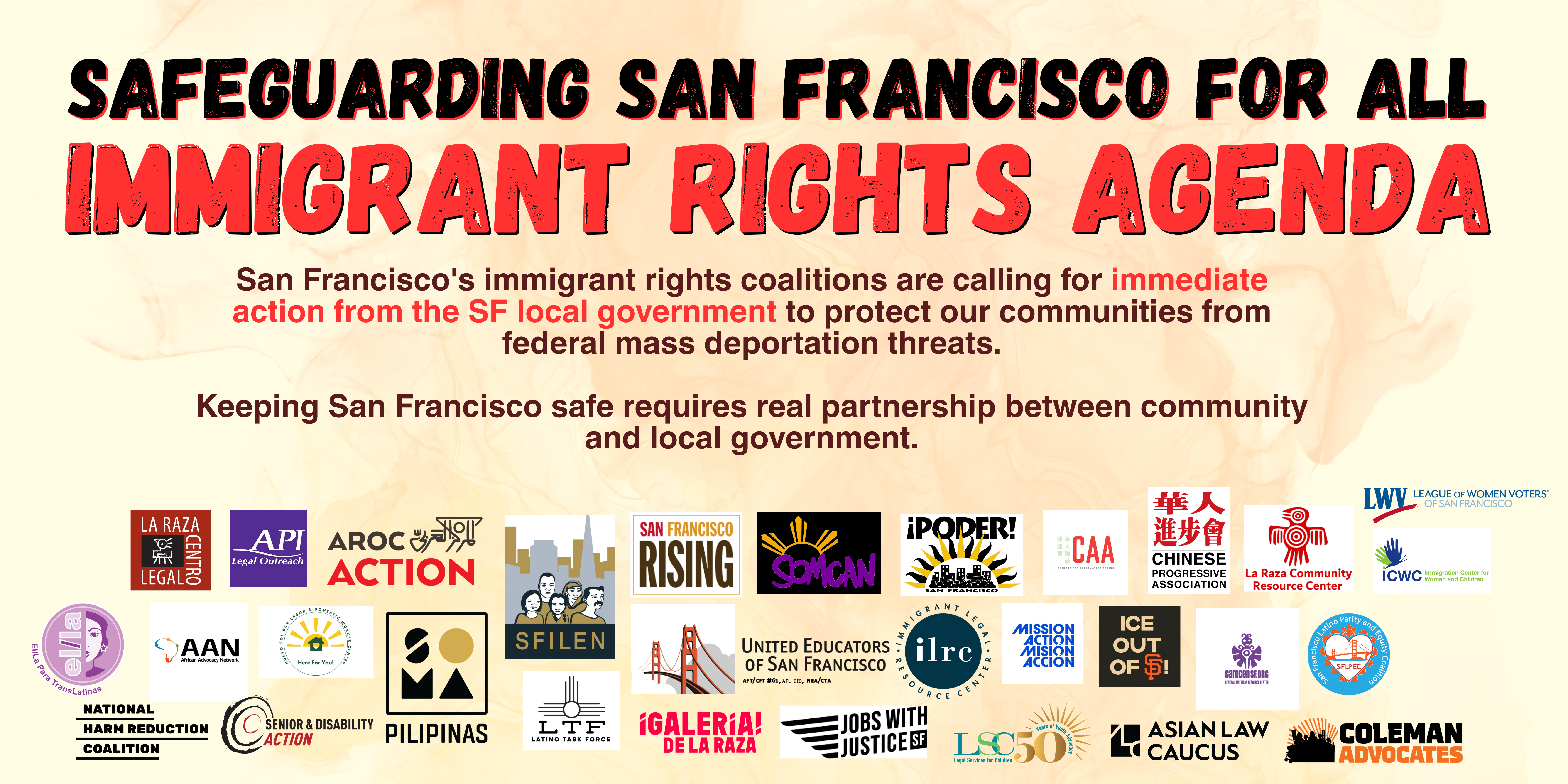 San Francisco's immigrant rights coalitions are calling for immediate action from the SF local government to protect our communities from federal mass deportation threats. Keeping San Francisco safe requires real partnership between community and local government.